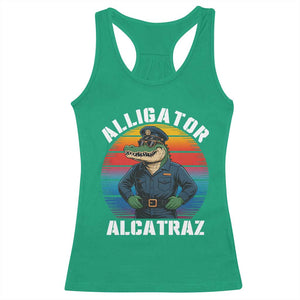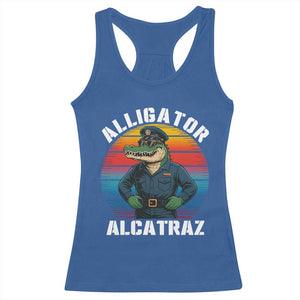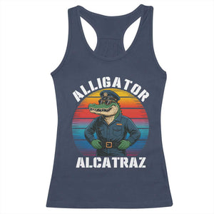 Bring a little swamp humor to your wardrobe with the Alligator Alcatraz Florida Racerback Tank Top from Print Your Wear. Featuring a playful gator cop with a retro sunset backdrop, this tank is the perfect blend of political humor and Florida flair — ideal for casual wear, gym sessions, or summer days.