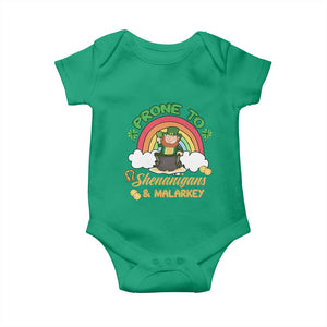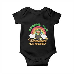 Funny St Patricks Day Baby Onesie Prone To Shenanigans and Malarkey Cute Leprechaun Rainbow