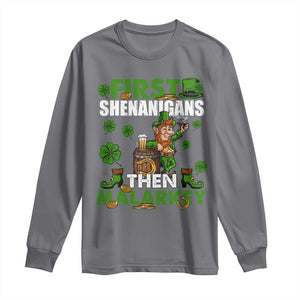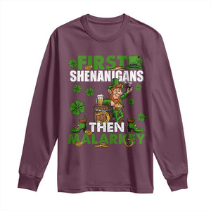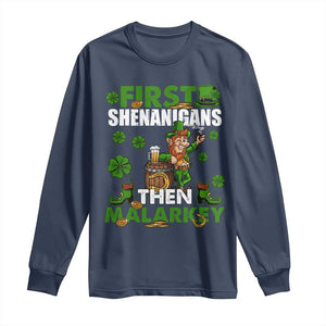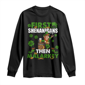 Funny St Patricks Day Long Sleeve Shirt First Shenanigans Then Malarkey Drinking Leprechaun