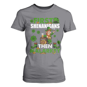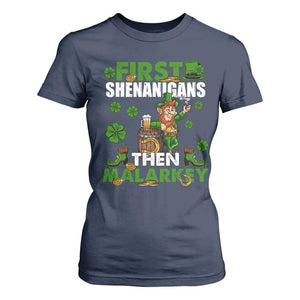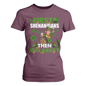 Funny St Patricks Day T Shirt For Women First Shenanigans Then Malarkey Drinking Leprechaun
