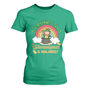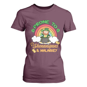 Funny St Patricks Day T Shirt For Women Prone To Shenanigans and Malarkey Cute Leprechaun Rainbow