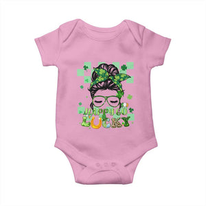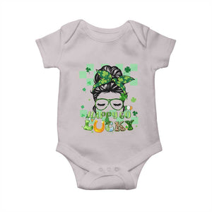 Funny St Patricks Day Women Baby Onesie Happy Go Lucky Messy Bun with Shamrocks