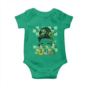 Placeholder Funny St Patricks Day Women Baby Onesie Happy Go Lucky Messy Bun with Shamrocks - PrintYourWear - Print Your Wear
