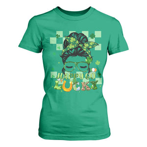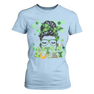 Placeholder Funny St Patricks Day Women T Shirt For Women Happy Go Lucky Messy Bun with Shamrocks - PrintYourWear - Print Your Wear