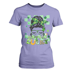 Funny St Patricks Day Women T Shirt For Women Happy Go Lucky Messy Bun with Shamrocks TS02