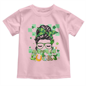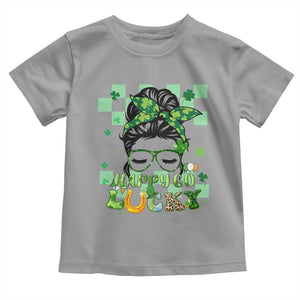 Funny St Patricks Day Women Toddler T Shirt Happy Go Lucky Messy Bun with Shamrocks