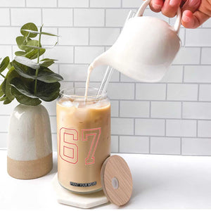 Our glass can comes with a sustainable bamboo lid featuring a secure rubber gasket to prevent spills and maintain your drink’s temperature. The matching clear acrylic straw makes sipping easy and adds an extra touch of eco-friendly style.