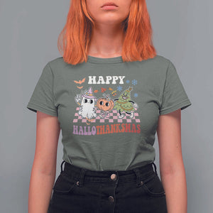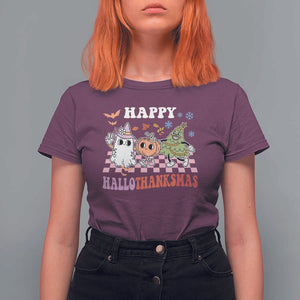 Placeholder Happy HalloThanksMas T Shirt For Women Halloween Thanksgiving Christmas Groovy - PrintYourWear - Print Your Wear