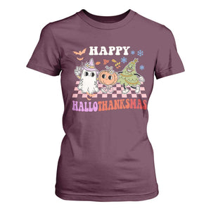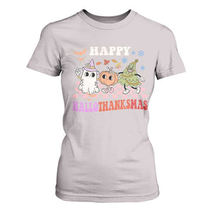 Happy HalloThanksMas T Shirt For Women Halloween Thanksgiving Christmas Retro Groovy Cute