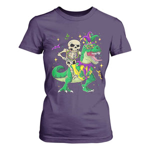 Mardi Gras Funny Skeleton On Dinosaur Jester Beads T Shirt For Women