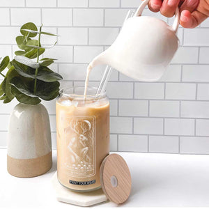 Our glass can comes with a sustainable bamboo lid featuring a secure rubber gasket to prevent spills and maintain your drink’s temperature. The matching clear acrylic straw makes sipping easy and adds an extra touch of eco-friendly style.